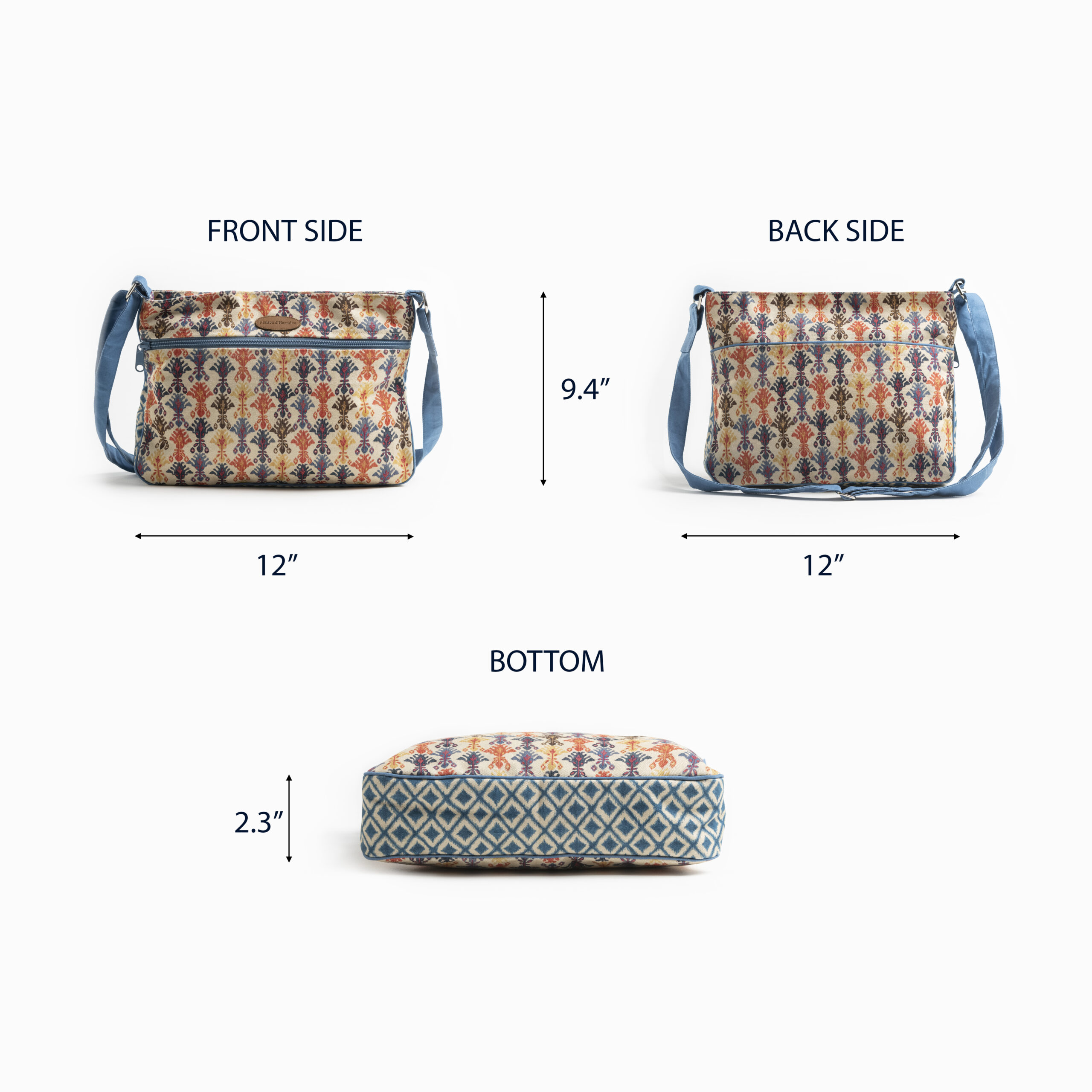 PACKAGE INCLUDES: 1 cross body bag made of 100% cotton measures Length – 12 Inch Height – 9.4 Inch, Width – 2.3 Inch.