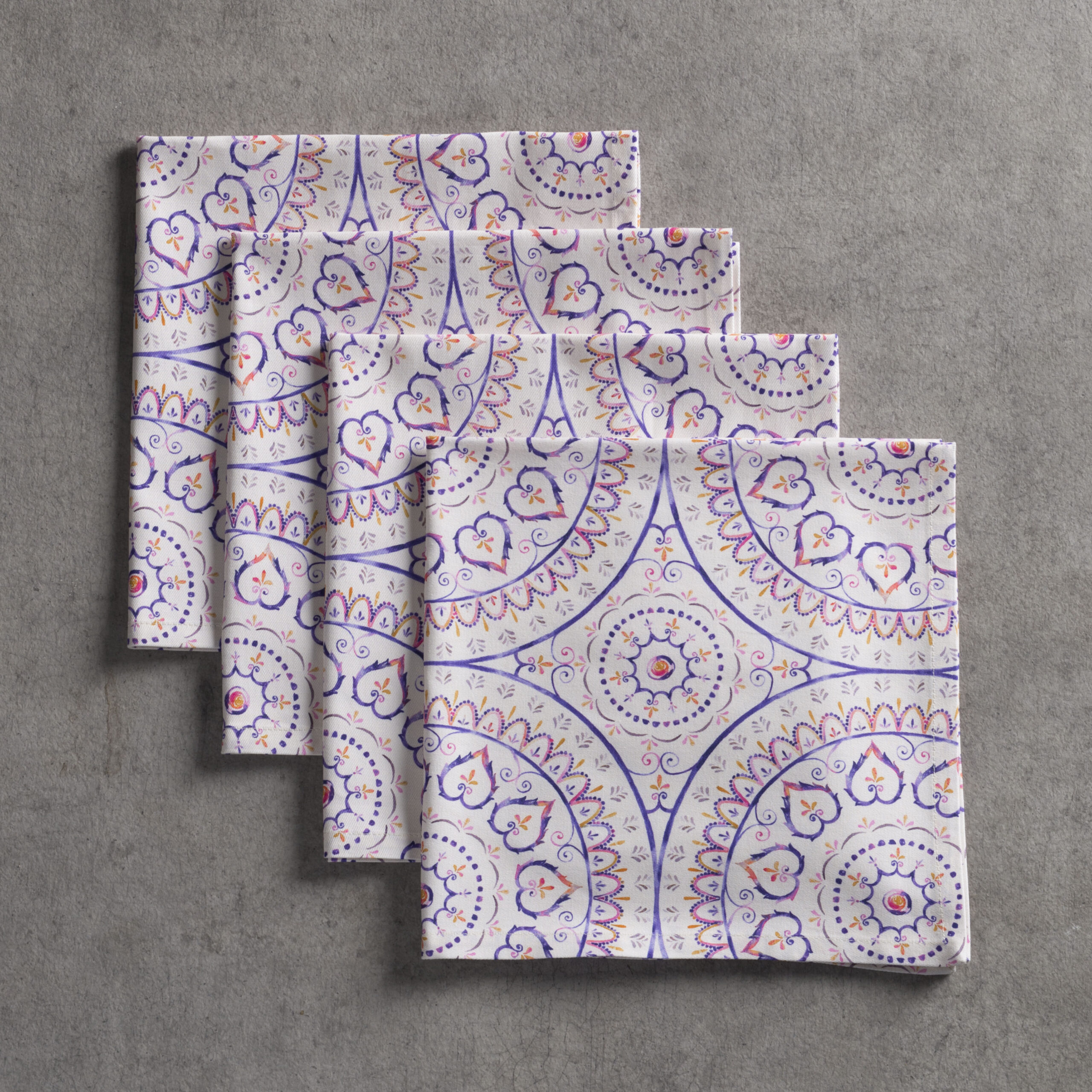 PACKAGE INCLUDES: Set of 4 Napkins sized 20″x20″. The napkins will certainly Bring lovely charm to your dining experience. Made with 100% Cotton fabric these dinner napkins are soft cloth napkins which provide a light but cozy feel to your dining table. Our products are Designed in Europe and Made in India.