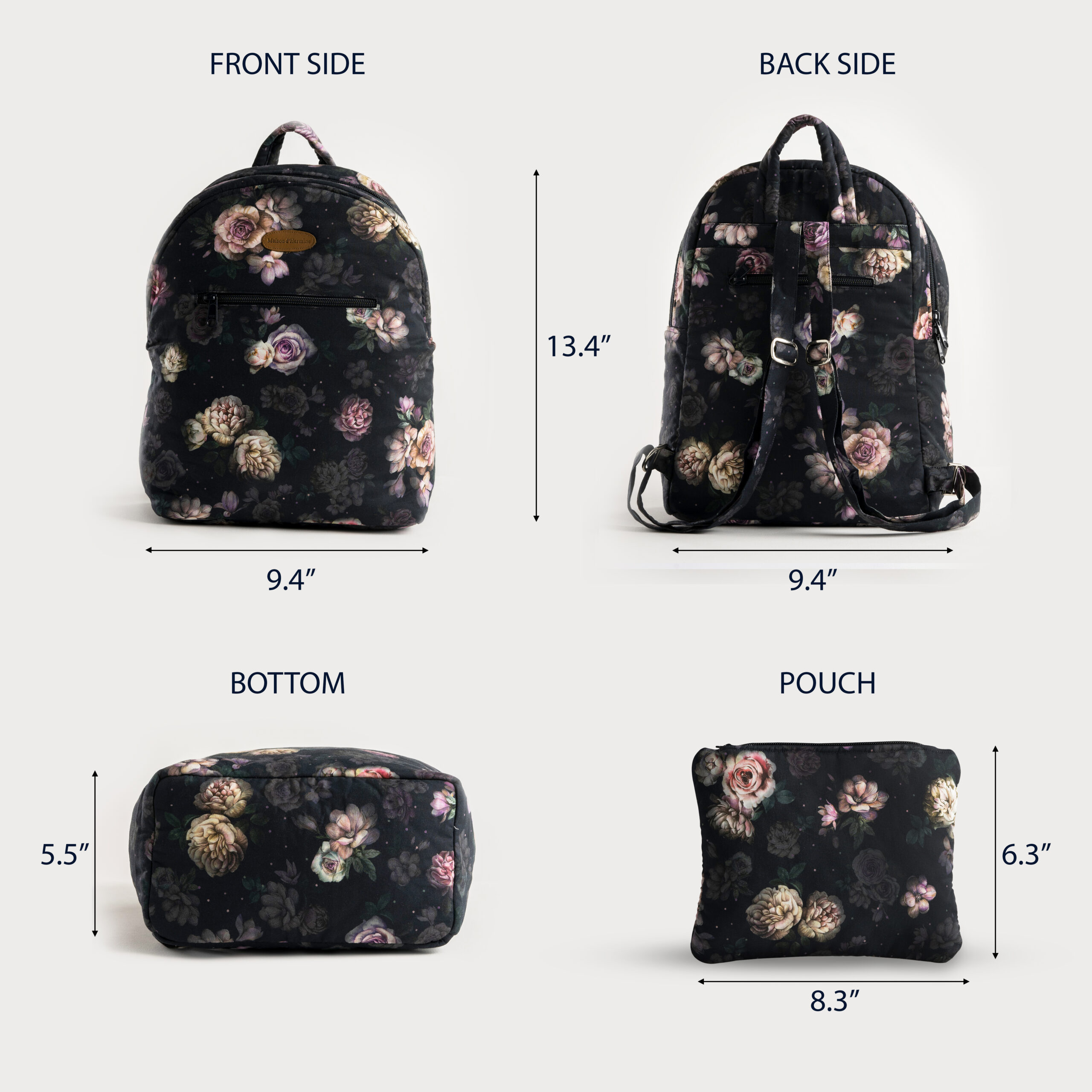 STYLISH & SIZED RIGHT: Maison d’ Hermine Backpack measures Length – 9.4 Inch Height – 13.4 Inch, Width – 5.5 Inch and pouch measure Length – 8.3 Inch, Height – 6.3 Inch.